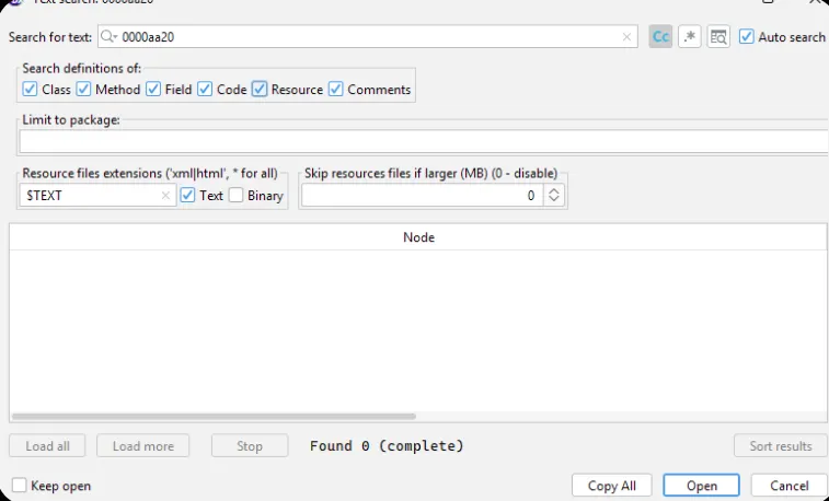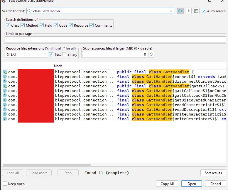 Arama kutusuna, sahada yakaladığımız UUID’yi (ör. 0000aa20 veya tam 128-bit formu) girerek uygulama içerisinde geçtiği sınıf ve metotları tespit ediyoruz.