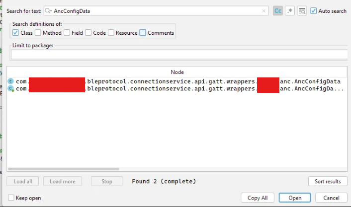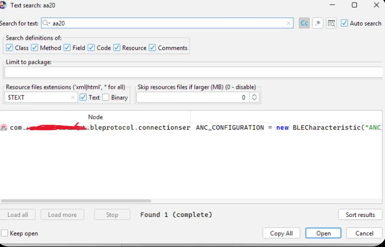 JADX ortamını açıp APK’yı içe aktardıktan sonra, daha önce cihaz üzerinde gözlemlediğimiz ANC ile ilişkili characteristic UUID’sini kod içinde arayarak başlangıç noktasını belirleyeceğiz. Bunun için global aramayı açıyoruz (Ctrl + Shift + F).