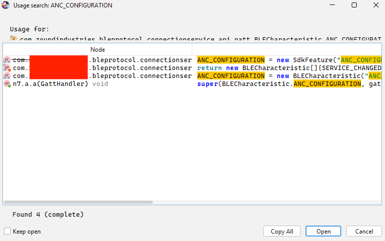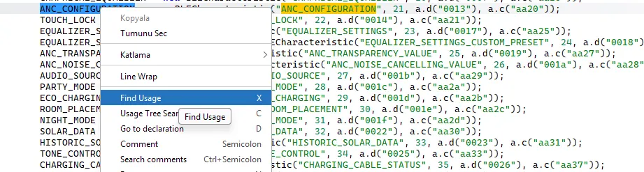 Daha önce doğrulanan ANC konfigürasyon UUID’si üzerinden JADX içinde Find Usage yaparak, bu karakteristiğin uygulama tarafındaki kullanım noktalarını incelemeye başlıyoruz.