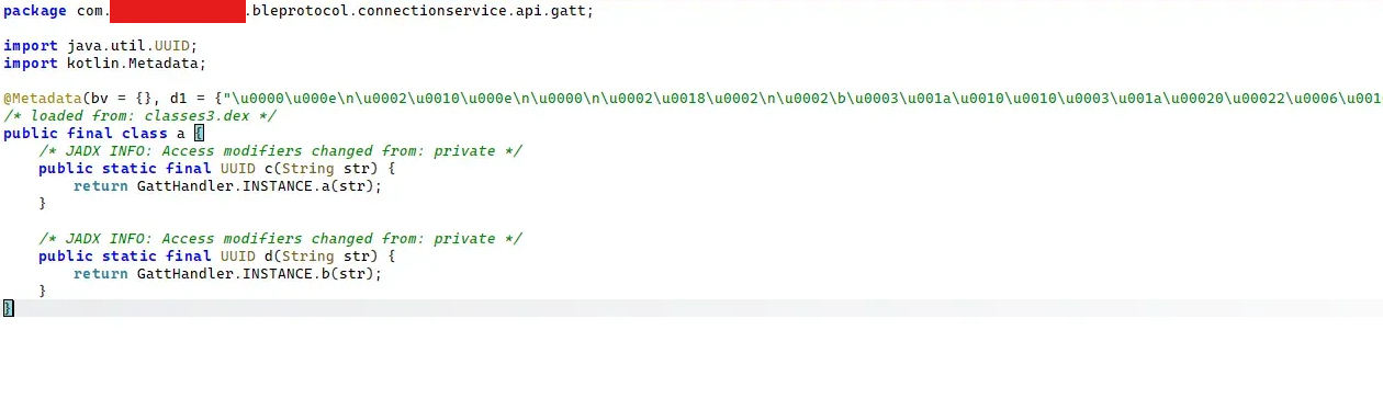 Bu aşamada, com.[XXXXX].bleprotocol paketi altındaki ilgili class üzerinden BLE kontrol akışı analiz edilmektedir.