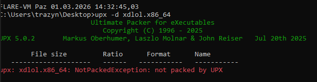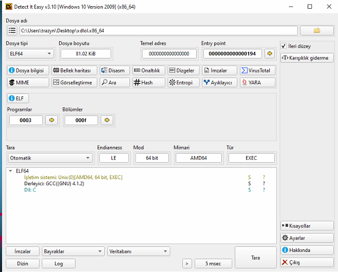 UPX ve Detect It Easy ile incelendiğinde, zararlının UPX gibi bir packer kullanmadığı (statically linked olduğu) ve ELF yapısının incelenebildiği görülmüştür