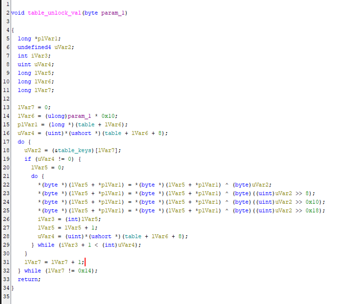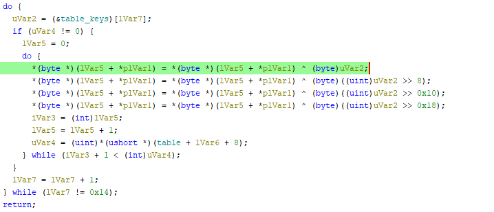 table_keys) bulundurmaktadır. - Döngü, her bir byte’ın deşifre işleminde bu dizideki 32-bit anahtarı alır; 4 byte’ı da mantıksal XOR işlemine (